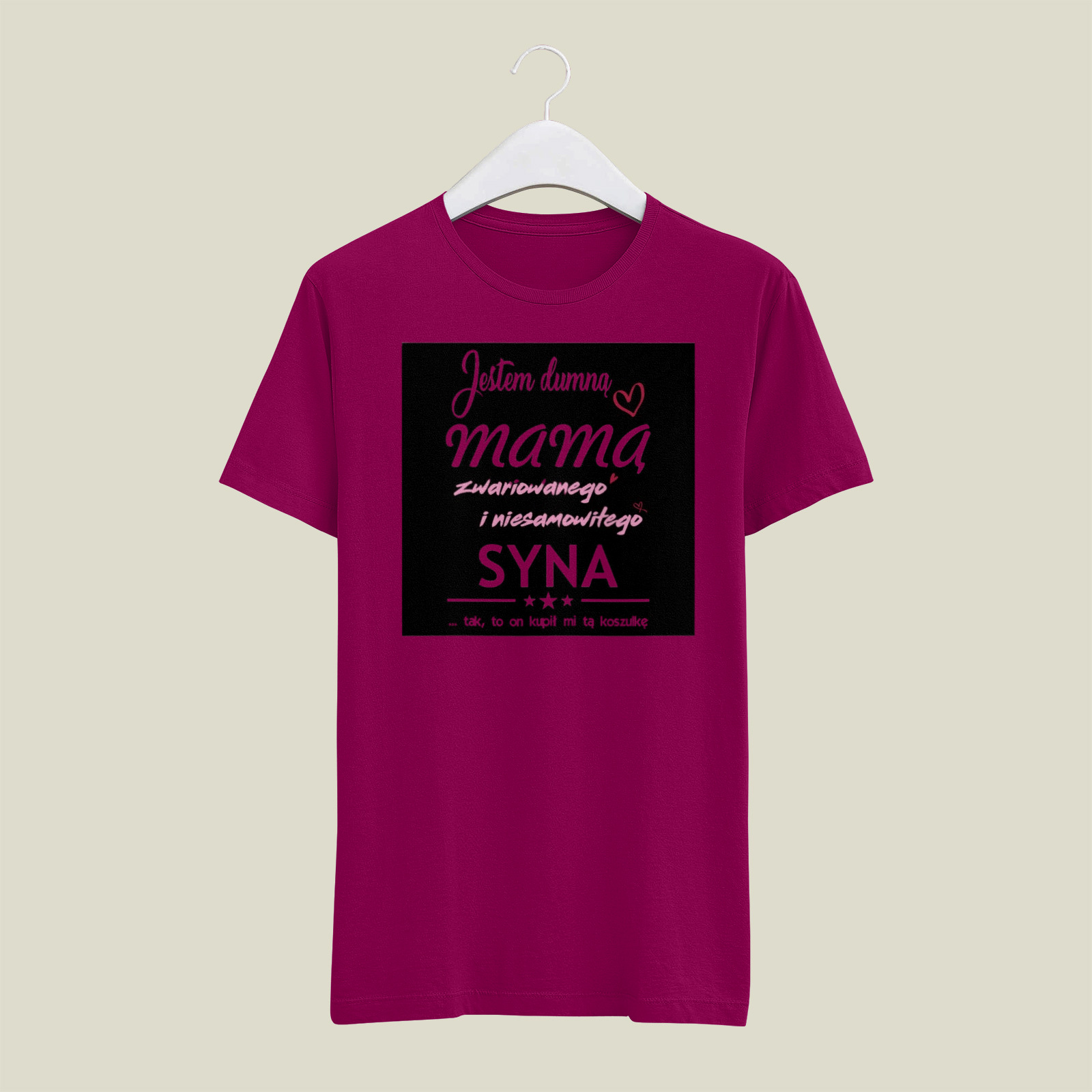 Wyjątkowa koszulka z nadrukiem „Jestem dumną mamą zwariowanego i niesamowitego syna… tak, to on kupił mi tę koszulkę” to idealny wybór na Dzień Mamy lub po prostu — bez okazji, ale z serca. 💙 Humorystyczny, a zarazem pełen miłości tekst w połączeniu z nowoczesnym designem w kolorach czerni, różu i bieli sprawia, że koszulka jest nie tylko stylowa, ale i bardzo osobista. To świetny prezent od syna, który chce powiedzieć “kocham Cię, Mamo” w zabawny i oryginalny sposób. Gwarantowany uśmiech i wzruszenie!