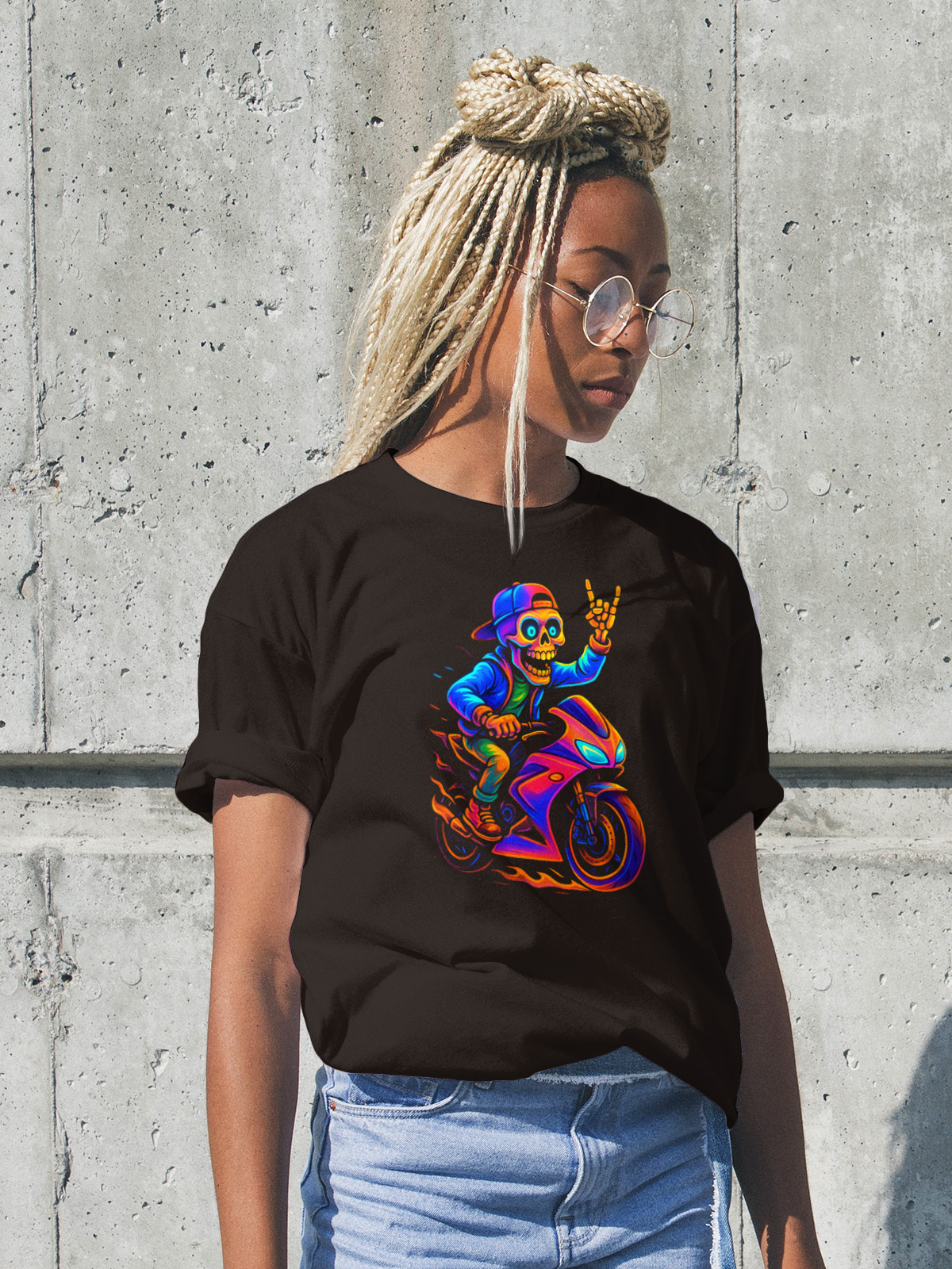 Jeśli prędkość to Twój żywioł, a dystans pokonujesz z uśmiechem (nawet szkieletora) — ta koszulka jest dla Ciebie! Neonowy kościotrup na motocyklu pędzi przez życie jakby jutro nie istniało, pokazując rockowy znak pokoju i totalny luz. Stylowa, zabawna i pełna mocy – idealna dla fanów adrenaliny, streetwearu i nieco mrocznego humoru.