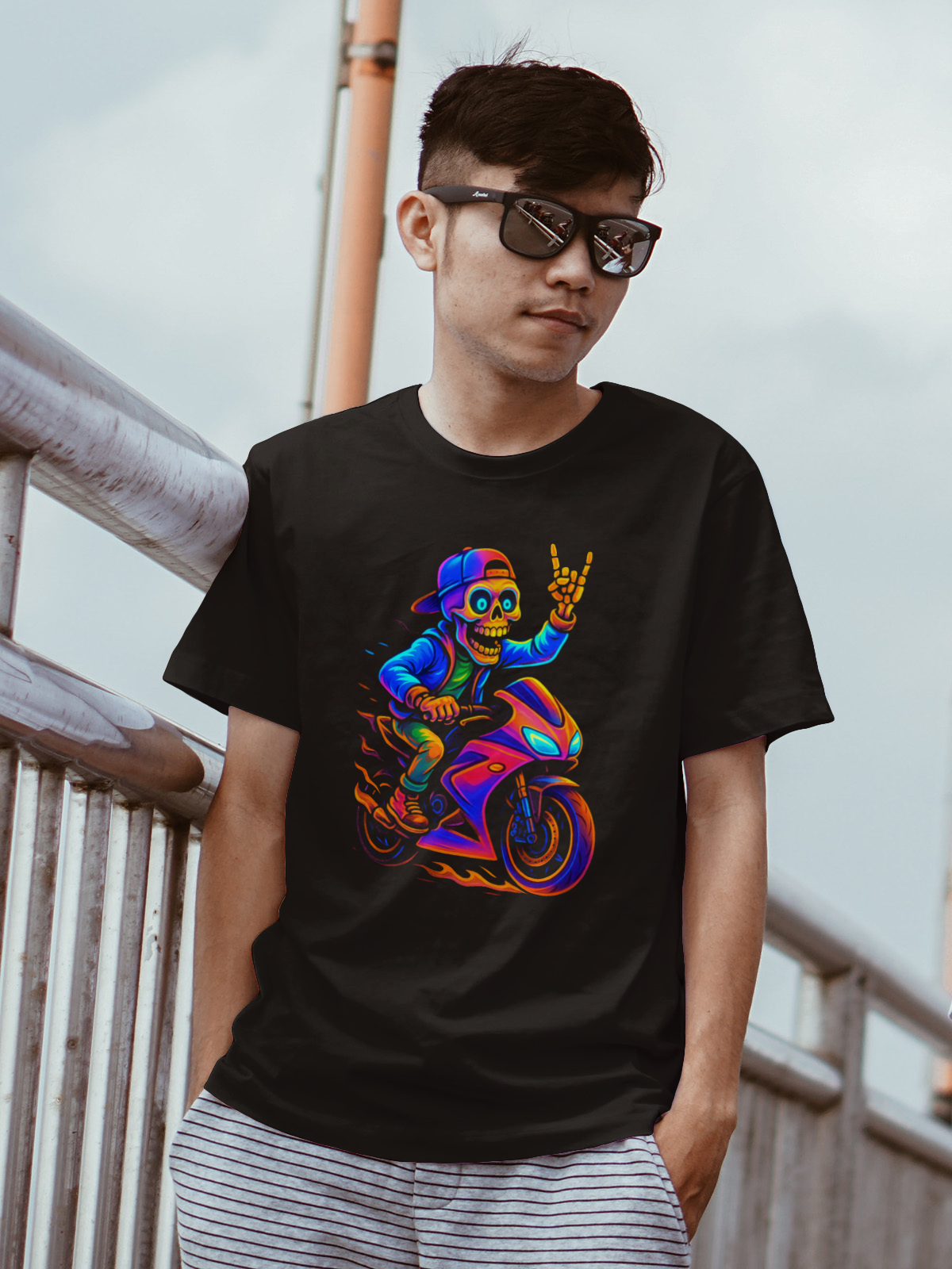 Jeśli prędkość to Twój żywioł, a dystans pokonujesz z uśmiechem (nawet szkieletora) — ta koszulka jest dla Ciebie! Neonowy kościotrup na motocyklu pędzi przez życie jakby jutro nie istniało, pokazując rockowy znak pokoju i totalny luz. Stylowa, zabawna i pełna mocy – idealna dla fanów adrenaliny, streetwearu i nieco mrocznego humoru.