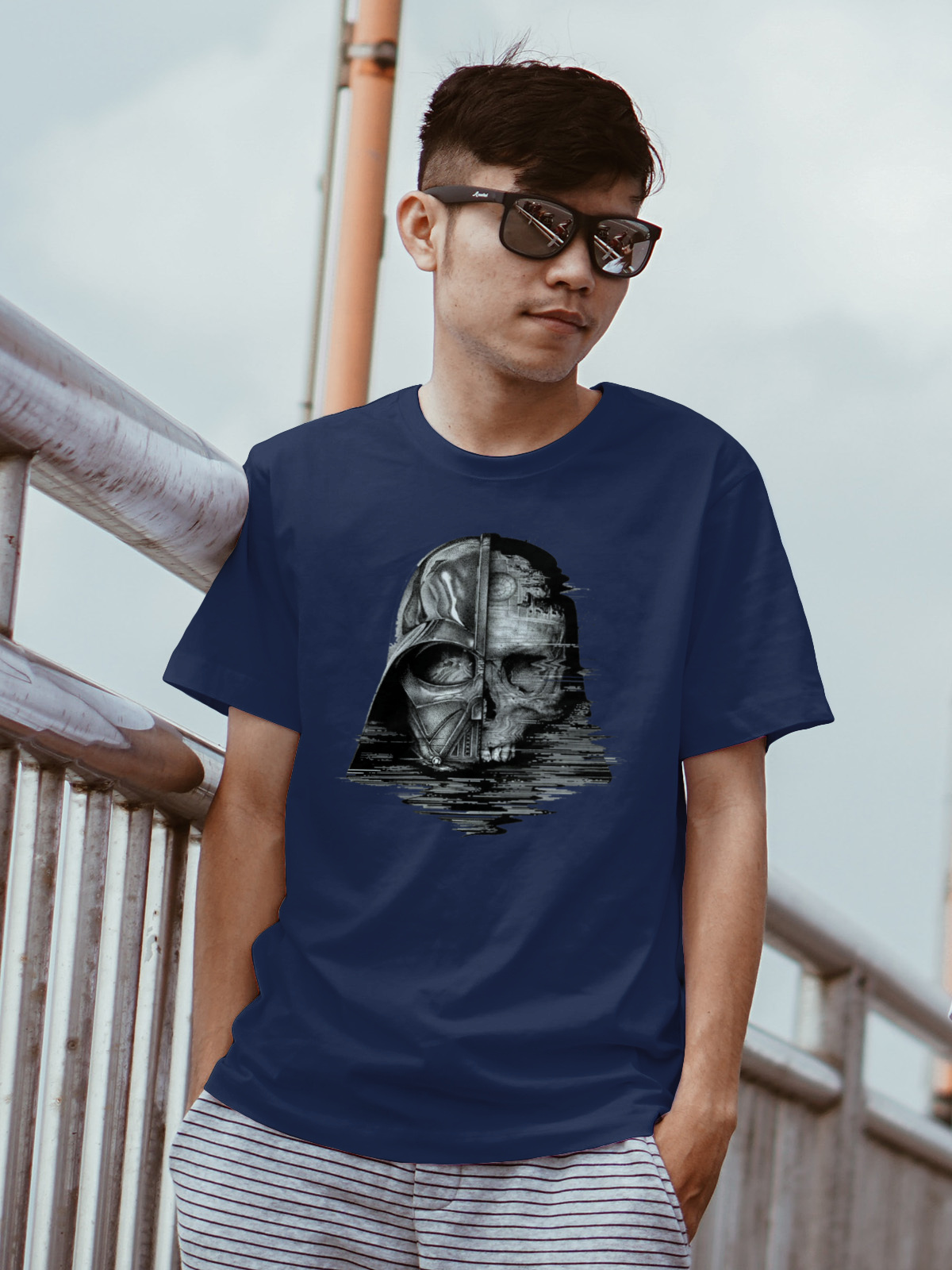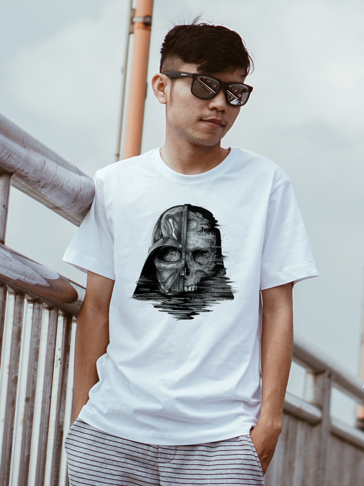 Grafika przedstawia połówkę słynnego hełmu, płynnie przechodzącą w realistyczną czaszkę — symbol przemijania, siły i tajemnicy. Czarno-szara tonacja i minimalistyczne detale sprawiają, że koszulka przyciąga wzrok, ale nie krzyczy — mówi za Ciebie.