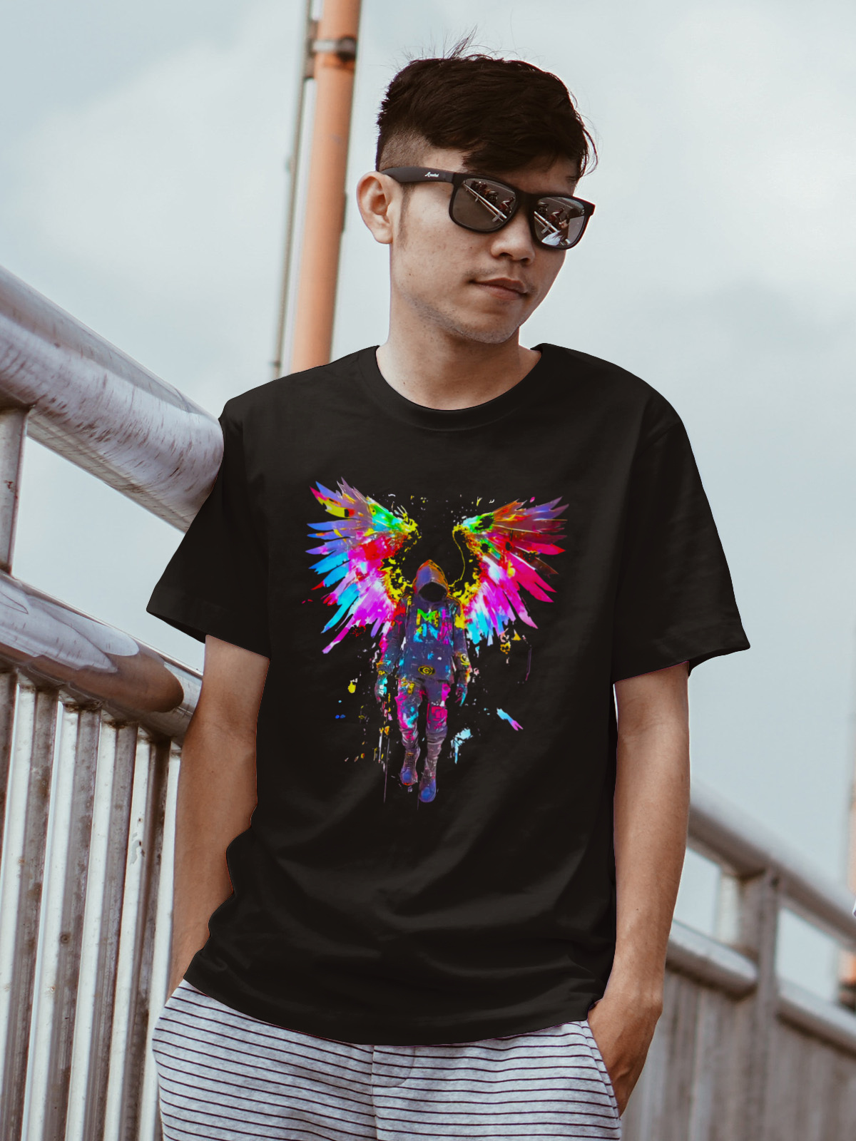 Ta wyjątkowa koszulka łączy w sobie postać astronauty z efektownymi, neonowymi skrzydłami, które eksplodują kolorami i przyciągają spojrzenia. Symboliczny nadruk to hołd dla tych, którzy nie boją się sięgać po swoje — nawet jeśli oznacza to wyruszenie w zupełnie inną galaktykę 🚀🌈