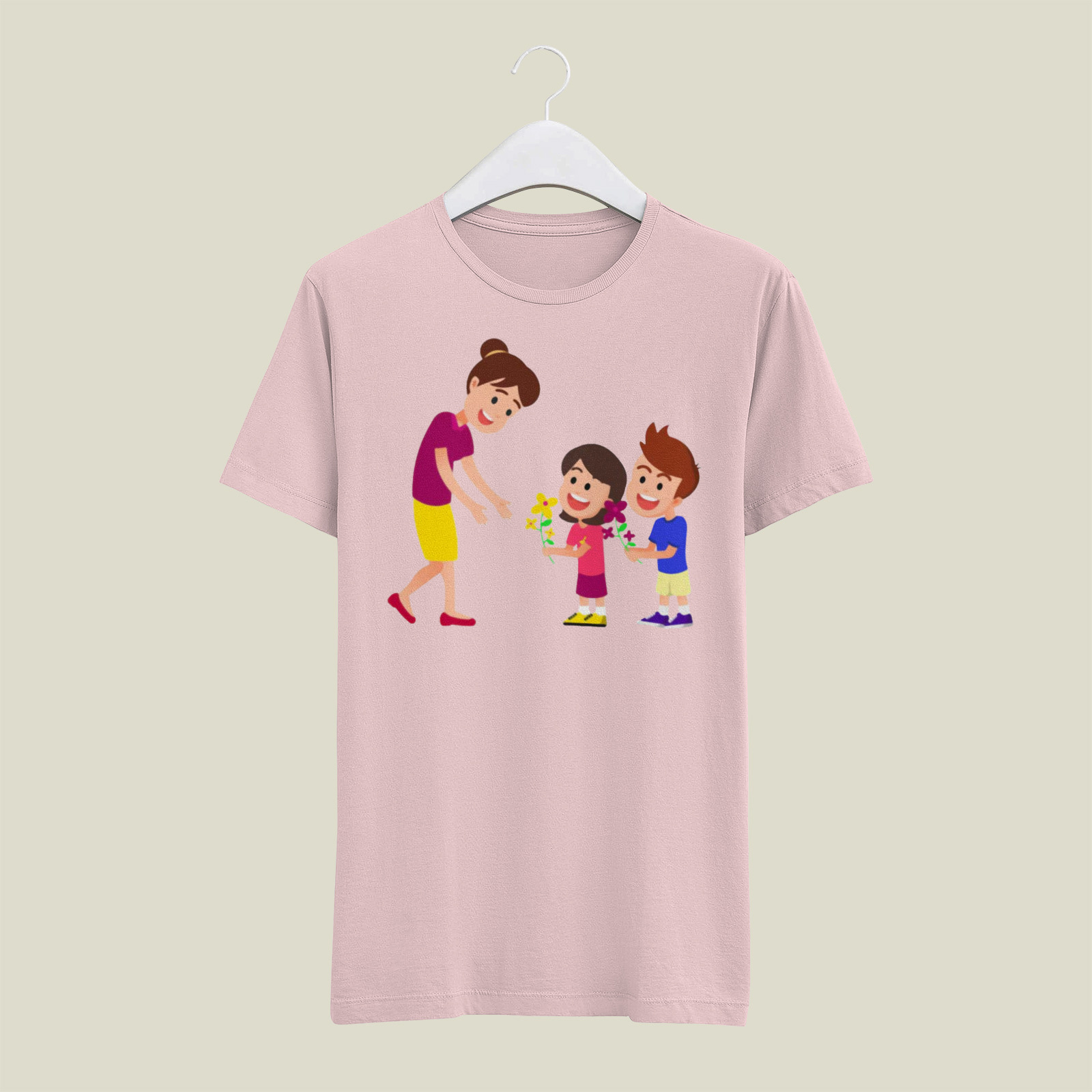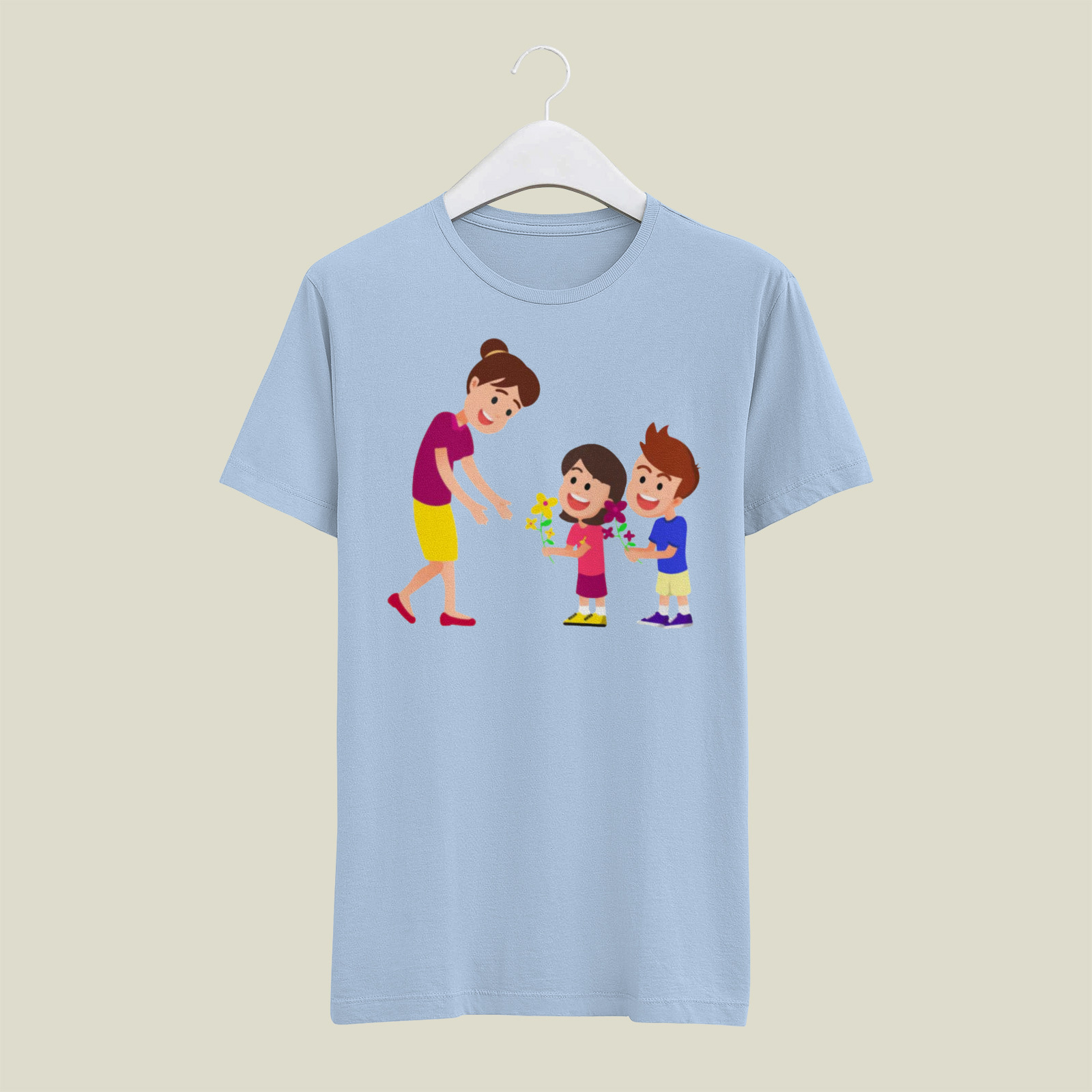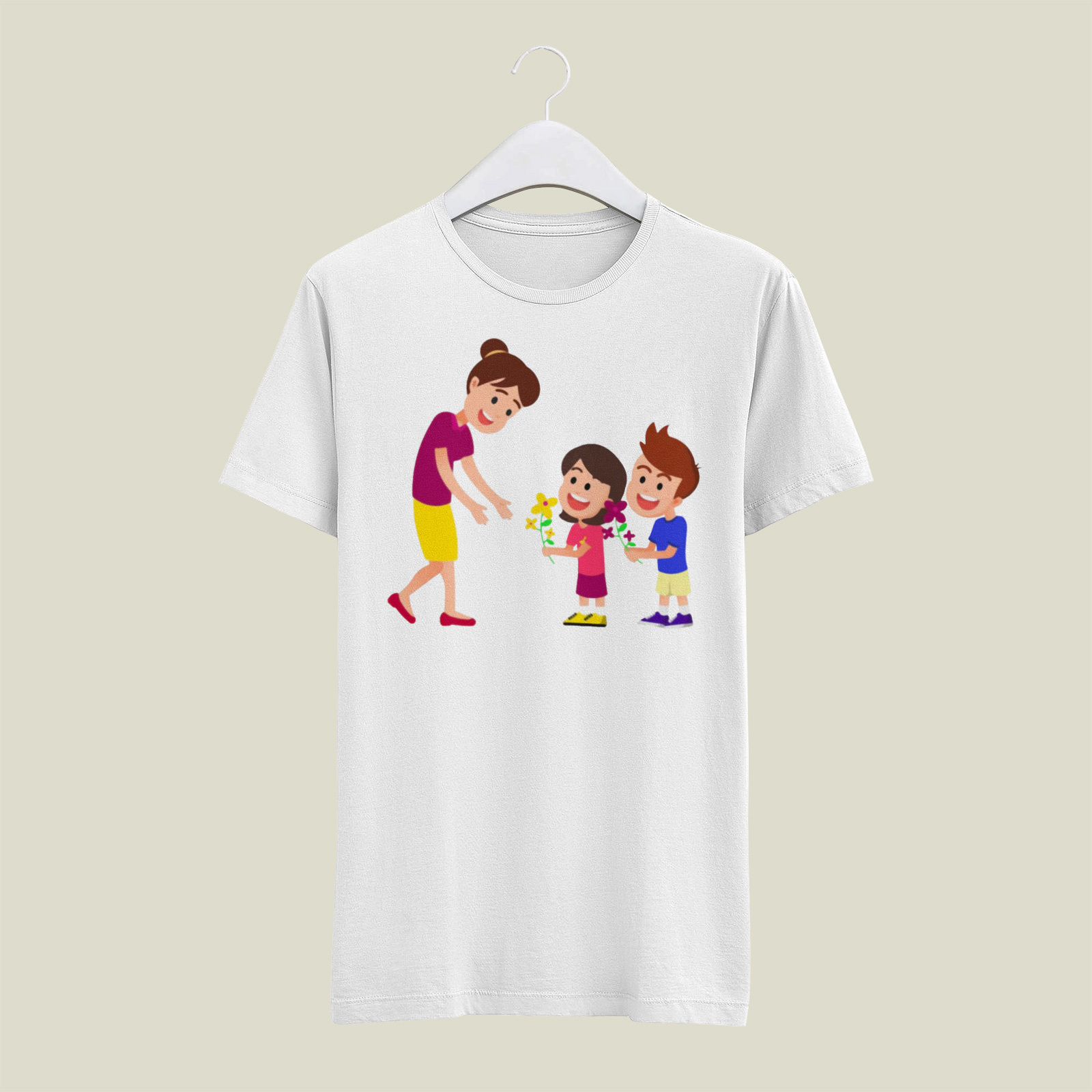 Radosna i pełna ciepła koszulka z grafiką przedstawiającą dzieci wręczające mamie kwiaty to doskonały wybór na Dzień Mamy! 🌸
