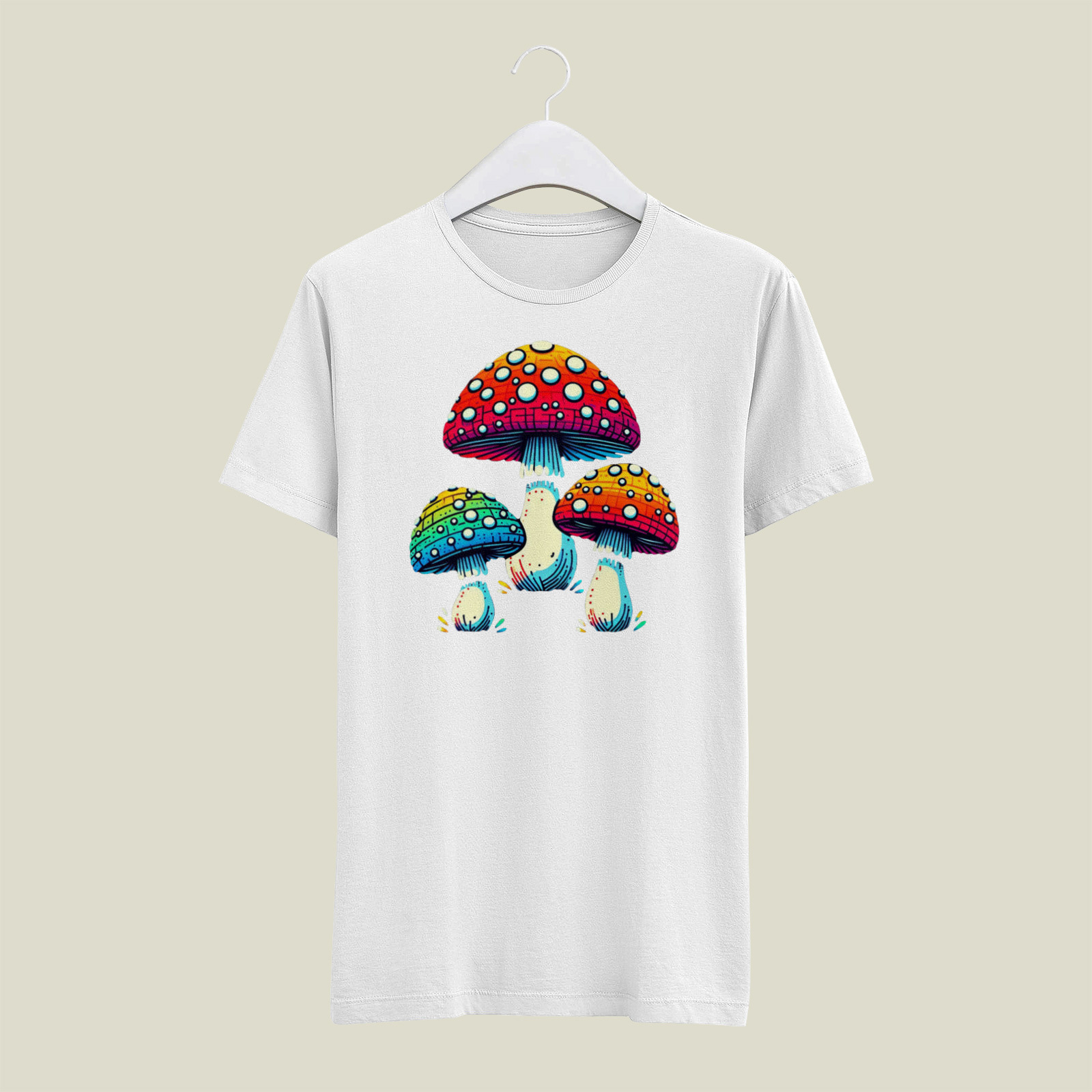 Wyrazista koszulka damska z grafiką w stylu psychodelicznym, przedstawiająca trzy kolorowe grzyby o intensywnych, neonowych barwach i bajkowym charakterze. 🌈🍄 Idealna dla fanów sztuki alternatywnej, estetyki retro oraz tych, którzy lubią się wyróżniać. Hipnotyzujące detale, żywe kolory i odrobina szaleństwa sprawiają, że ten wzór to prawdziwy manifest wolności i kreatywności. Koszulka świetnie sprawdzi się na festiwale, wieczorne wypady, lub po prostu jako mocny akcent w codziennej stylówce. Dla ludzi z wyobraźnią!