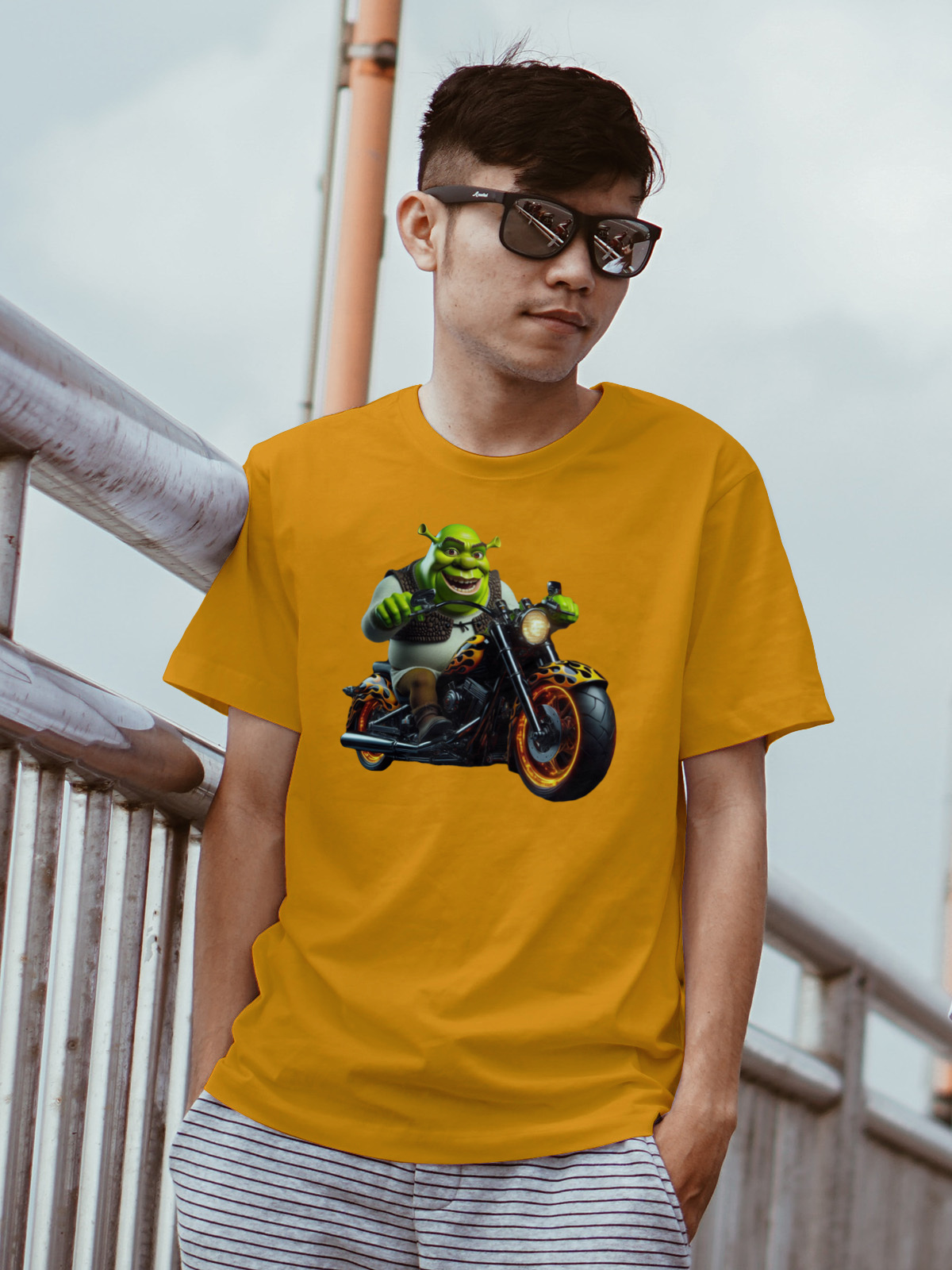 Zwariowana grafika przedstawia dobrze znaną, zieloną postać w zupełnie nowej roli — jako nieustraszonego motocyklistę, pędzącego na maszynie w płomiennym stylu. Połączenie humoru, luzu i mocnej motoryzacyjnej energii sprawia, że ta koszulka to obowiązkowa pozycja dla każdego fana nietypowych wzorów z charakterem. Idealna na prezent, dla miłośnika kreskówek, motocykli lub po prostu tych, którzy mają dystans do siebie i lubią się wyróżniać. Bo kto powiedział, że ogry nie jeżdżą na chopperach?