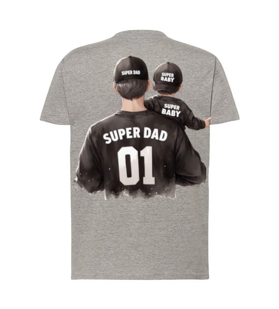 Oto wyjątkowa koszulka, która z pewnością zachwyci każdego tatę! Szary T-shirt przedstawia wzruszającą ilustrację ojca trzymającego swoje dziecko, obaj ubrani w czapki z napisami “SUPER DAD” i “SUPER BABY”. Na plecach taty widnieje dumny napis “SUPER DAD 01”, co podkreśla jego numer jeden w życiu dziecka. To doskonały prezent, który pokazuje, jak ważna jest rola ojca i jak wielką radość daje bycie tatą. Idealna na każdą okazję, od Dnia Ojca po codzienne noszenie, ta koszulka to wyjątkowy sposób na wyrażenie miłości i dumy.